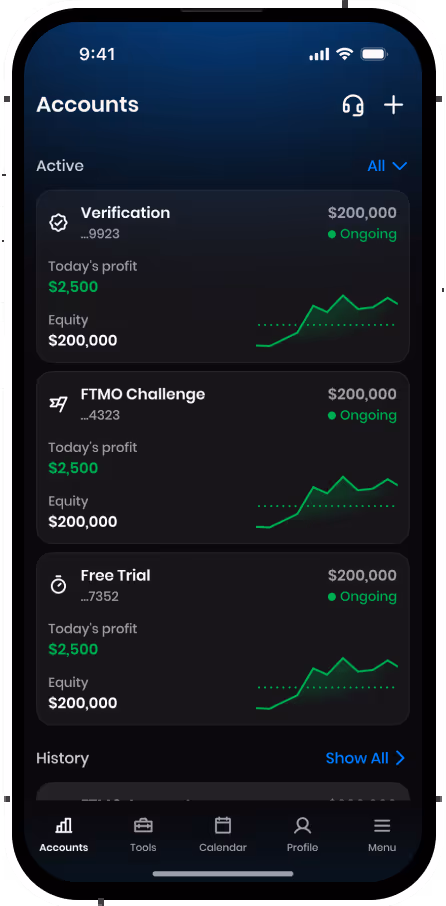 The FTMO Challenge puts your trading skills to the test. It is the first step towards an FTMO Rewards Account, giving you the chance to trade with simulated capital and earn real-money rewards without risking your own funds.